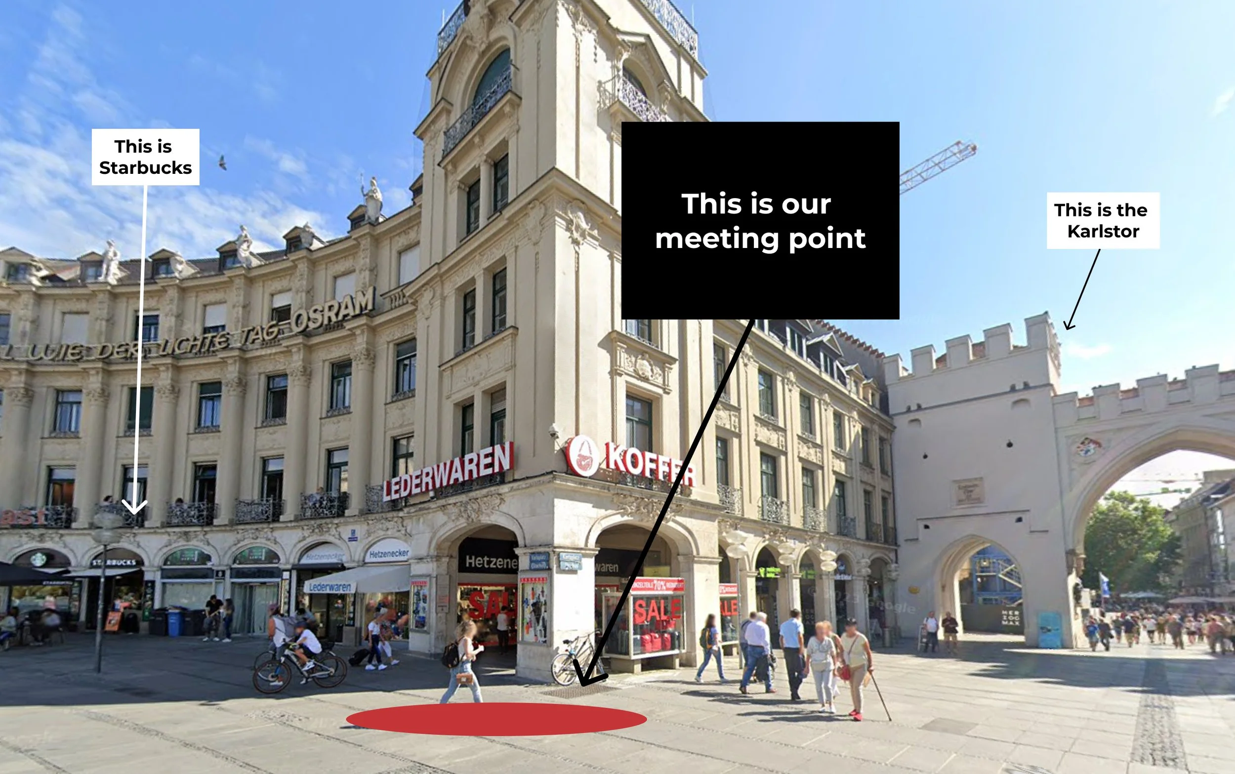 Meet directly in an area between Starbucks and McDonald's, facing the Karlstor gate.